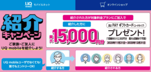 ご家族やご友人にUQ mobileを紹介して最大15,000円分のauPAYギフトカードがもらえる!!