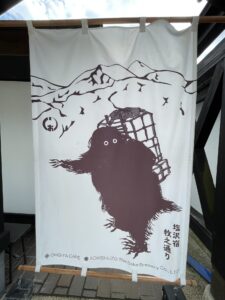 〈昔の積雪が記録されている柱〉 〈水木しげる氏が描いた雪男〉